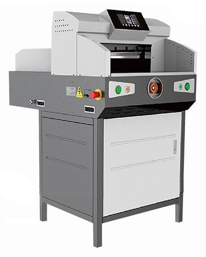 The world’s most advanced 46cm cutter at the world’s best price. The totally new 46cm cutter offers copyshops all the features previously found only on very large professional machines that cost 1000’s more. Compare with the others: full 46cm cutting table depth, others offer only 35cm, extra deep 23cm front table for cutting longer sheets, others offer only 15cm, electrically powered paper press, no more sheet slippage when cutting glossy paper, other use a manual press or weak springs, deepest cutting depth in its class up to 5cm, other have only 3 or 4cm depth, servo controlled backguage with 80 programs, with push out function! Others have only manual backguage settings. HSS knife*, more than 12000 cutting cycles before regrinds! Full LCD display with keyboard! Others only offer no display at all or as an expensive option. Overhanging front guard for extra long paper. *HSS knife optional.